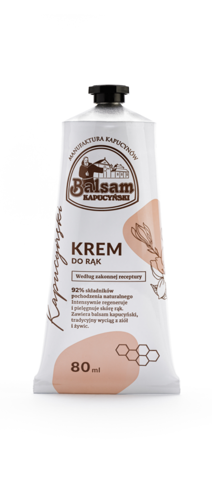 Krem kapucyński do rąk, powstał z inspiracji i troski o ochronę kobiecych dłoni. To produkt, który łączy w sobie starannie dobrane składniki, tak, aby zapewnić skórze doskonałą pielęgnację. Do jego produkcji, wykorzystaliśmy tradycyjną, zakonną recepturę Balsamu Kapucyńskiego.